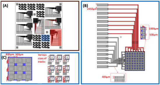 In the large pixel 8 × 8 array, the size of each pixel is 1000 μm × 1000 μm with a gap of 500 μm, which is shown in Figure 2B. The linewidth of the connecting tracks is 500 μm, while the width of the connector pitch is 2540 μm to match the flexible printed circuit (FPC) connector used for testing.