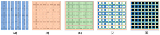 The first step of printing EL lamps is manufacturing the screen. In this project, to test the resolution limitation of screen-printing method, two layouts for the displays were designed using Tanner L-Edit software. The screen design is shown in Figure 2A, which has a print area of 10 cm × 10 cm. It consists of seven large pixel arrays (one of which is labelled with the red shaded area in Figure 2A) and eight combinations of nine small pixel arrays (one of which is labelled with the blue shaded area in Figure 2A), plus six alignment patterns to aid registration of the various layers in the printing process. The screen details (mesh size and emulsion thickness) are given below for each layer.