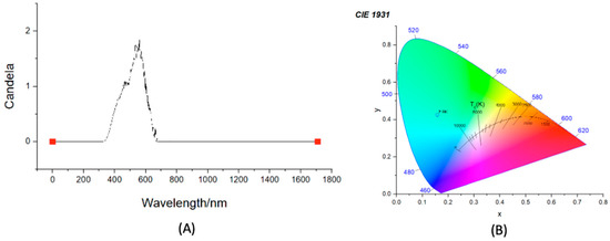 Measured luminance (A) and CIE 1931 colour space (blue circle) (B).