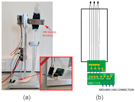 Testing set-up where the motor is at the top left side where also the 180-degree rotation takes place. (a) Machine set-up highlighting the connection between ADC and sample and where the 180-degree bending takes place. (b) Sample set-up highlighting the connections between interposer board/yarns and interposer board/ADC board.