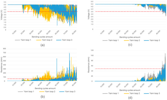 As mentioned earlier, the samples were flexed 180 degrees for 100,000 cycles or until the voltage dropped in at least two yarn loops for 10 seconds after bending. The failure points were based on the final needs of the application. Voltage under 3.5 V or resistance rise to 50 ohms was considered a failure point. The voltage drops are seen in Figure 3a,c comparing two different conductive yarns during the bending tests.