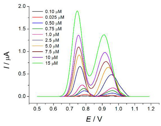 Differential pulse voltammetry was used for the simultaneous quantification of tartrazine and brilliant blue FCF in phosphate buffer pH 7.0. Well-resolved oxidation peaks of colorants at 0.77 and 0.97 V for tartrazine and brilliant blue FCF, respectively, were observed on the voltammograms (Figure 2). Oxidation currents increase linearly with the growth of the colorant’s concentration in the ranges of 0.10–2.5 and 2.5–15 µM for tartrazine and 0.25–2.5 and 2.5–15 µM for brilliant blue FCF with detection limits of 0.043 and 0.041 µM, respectively. The limits of detection are worse than for the other electrodes for the determination of tartrazine and brilliant blue FCF [19,20] but improved vs. multi-walled carbon nanotubes–carbon paste electrode [21]. Nevertheless, simultaneous determination is impossible at the carbon ink film-modified carbon black–polyethylene composite electrode [19] as far as detection is performed at the various pH for tartrazine and brilliant blue FCF. Method [20] requires pre-concentration for 500 s complicating the measurement procedure.