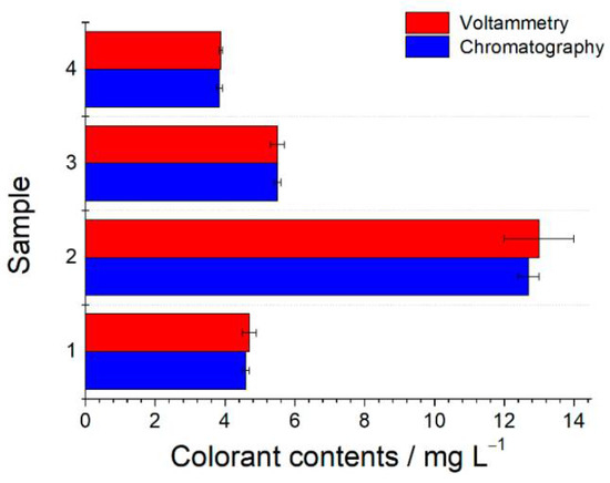 Practical application of the electrode has been demonstrated on soft and isotonic sports drinks. Sample 1 is free of tartrazine while samples 2–4 contain both colorants but the concentration of brilliant blue FCF is too low and cannot be determined by voltammetry. Standard addition method data confirm that oxidation peaks of real samples belong to the colorants. The results of soft and isotonic sports drinks analysis are presented in Figure 3. Voltammetric data agree well with that obtained by high-performance liquid chromatography [32]. t- and F-tests confirm the absence of systematic errors of determination and similar precision of both methods.