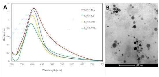 Silver nanoparticles were obtained with different stabilizers: AA, TCS, PVA, and PVP. The samples presented an absorption band of around 400 nm (Figure 1A), which indicated the formation of spherical AgNPs.