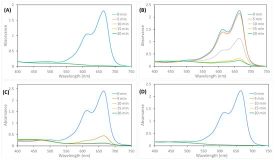 For the MB degradation, 0.5 mL of methylene blue (0.32 mol.L−1), 0.1 mL of NaBH4 (0.05 mol.L−1), and AgNPs (1.0; 0.75; 0.50 or 0.25 mL) were mixed in water, obtaining a final volume of 2.60 mL. The reaction was monitored by absorption spectroscopy (UV-Vis) every 5 min.