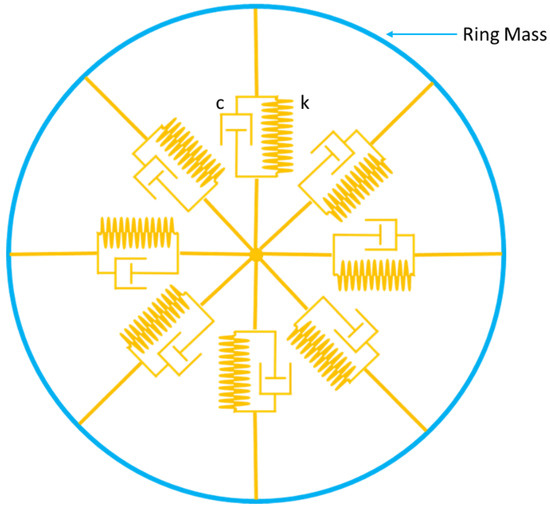The schematic view of the vibrating ring mass system with springs and damping coefficient.