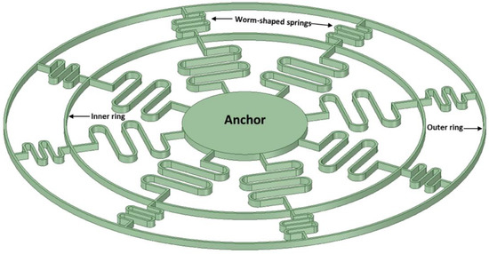The proposed gyroscope design comprises double resonator rings, sixteen worm-shaped springs, and one centrally placed anchor. The sixteen worm-shaped springs were placed in two sets. The large sizes of the eight springs were placed with the internal set and attached to the internal ring and the centrally placed anchor. The small sizes of the eight springs are placed with the external set and attached to the external and internal rings of the gyroscope. The proposed vibrating ring gyroscope is shown in Figure 3.