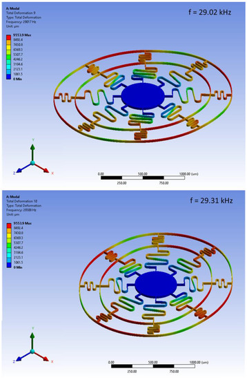 The finite element analysis of the proposed design has been conducted using the ANSYS software. The modal analysis describes the basic vibrational shapes of the selected design structure. The modal analysis provides information regarding natural frequencies, different vibrational shapes, structure displacement, and the vibration stability of the structure. The modal frequencies for mode n = 1 are shown in Figure 4. The elliptical shapes of vibrations for the vibrating ring gyroscope can be seen in Figure 4.