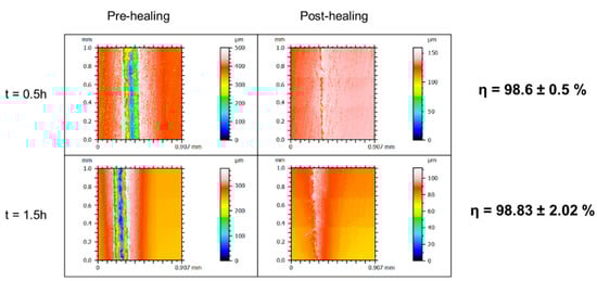 The images taken by the profilometer were processed with the analysis software MountainsMap® to obtain the volumes of both the initial and healed cracks, and the self-healing efficiency, η, was defined as follows: