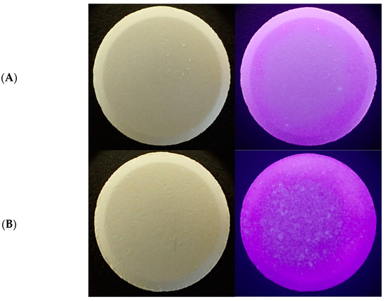 The external appearance of the effervescent tablets was also assessed using an Olympus Tough camera with a Dermlite attachment (Olympus Europa Se & Co. KG, Hamburg, Germany). Images under visible and UV lights were taken.