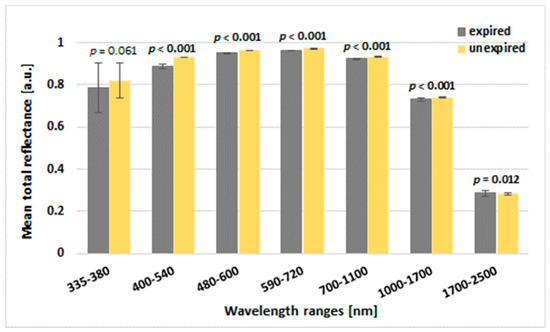 p < 0.001). In turn, a significantly higher value of THR for the range of 1700–2500 nm was observed for expired tablets than for unexpired tablets (