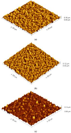 Figure 1 shows three-dimensional topography images of the selected samples’ surfaces. It can be seen in Figure 1 that there is not much difference between the spin-coated pristine CS (Figure 1a) and CS with 0.01% GO (Figure 1b). Figure 1c represents the surface topography of CS-GO when it is deposited using the layer-by-layer method. By visual examination of the images, it can be inferred that the average height was reduced when GO was added to CS. In addition, the layer-by-layer method results in a modified morphology with reduced roughness.