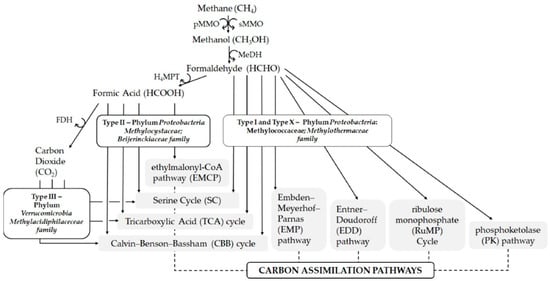 Different types of methanotrophs and their metabolic pathways: pMMO—particulate monooxygenase, sMMO—soluble monooxygenase, MeDH—methanol dehydrogenase, H4MPT—tetrahydromethanopterin, FDH—formate dehydrogenase. Modified with permission from Kalyuzhnaya et al. [].