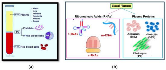 (a) The components of human whole blood depicting the RBCs settling at the bottom of a test-tube due to the gravitationally assisted sedimentation; (b) the constituents of blood plasma depicting the volumetric percentage of plasma proteins and various RNAs.