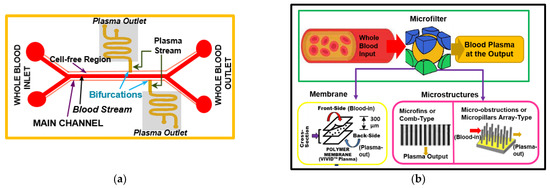 A schematic showing the operating principal of microfluidics and microfiltration-based plasma separation: (a) microfluidics-based self-driven passive plasma separation through the cell-free layer and bifurcations; (b) microfiltration-based self-driven passive plasma separation through membrane-assisted and microstructure-assisted plasma filtration.