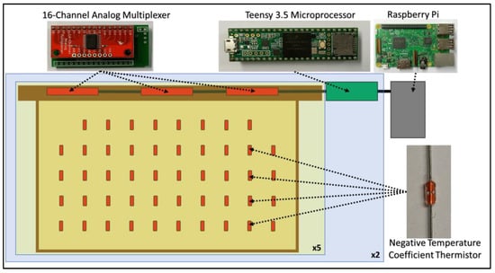 The sensor array was laid out evenly with each thermistor being 3 cm away from another in all directions (Figure 1). The multiplexers handled the successive reading of each sensor it was connected to, and the outputs were connected to a Teensy 3.5 microprocessor []. Each Teensy has twenty-seven analogue input pins which could handle nine frames. However, the hive has ten frames; as such, two Teensy 3.5 were used to accommodate five frames each.