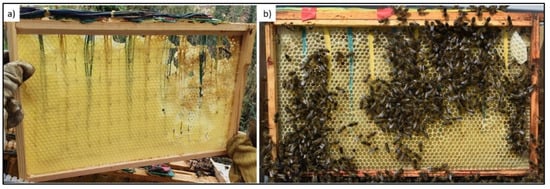 Inspection photographs from the spatially resolved temperature measurement systems. (a) A frame in the first system on 21 September 2021 showing rejection by the colony which has chewed away foundation wax thereby exposing the electronics. (b) A frame at the centre of the box on the second system on 18 May 2022 showing acceptance of the frames with the sensor array, having built fresh honeycomb over the top of sensors and the cells being used for brood rearing.