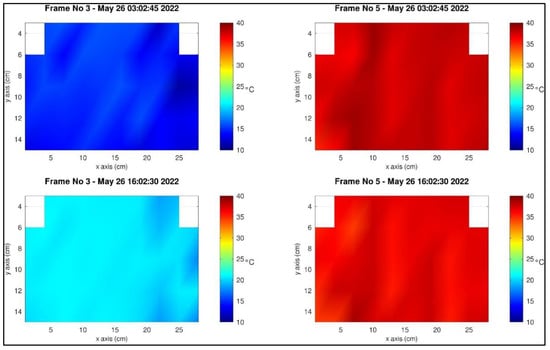 Additionally, Figure 4 displays the temperature variation detected from across a single frame. Frame 5 has patches of warmer temperatures with other areas exhibiting lower temperatures, and this is seen at both timepoints. The temperature of Frame 3 was much lower, closer to 10–15 °C at 3 am and around 20 °C at 4 pm. Again, the temperature varies across the frame with some sections being colder than others.