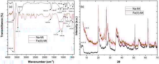 Analysis of Na-Mt and Fe(II)-Mt by (a) FTIR and (b) X-ray diffraction.