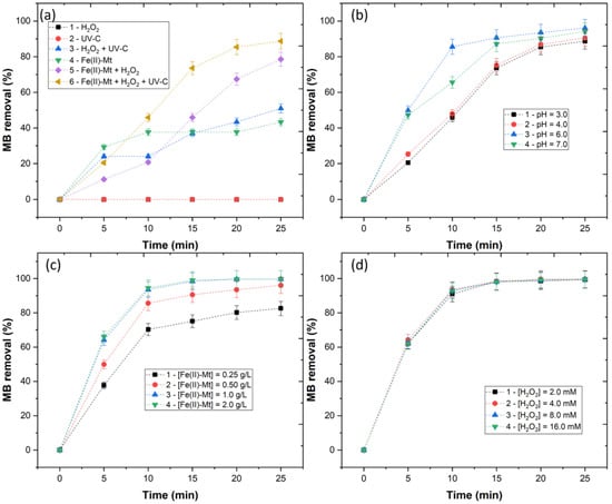 Removal of MB by (a) variation of processes, (b) variation of pH (3.0–7.0) with [Fe(II)-Mt 0.5M] = 0.5 g/L, [H2O2] = 4 mM, [MB] = 0.16 mM, radiation = UV-C (254 nm), time = 25 min (c) variation of Fe(II)-Mt 0.5M catalyst concentration (0.25–2.0 g/L), with pH = 3.0, [H2O2] = 4 mM, [MB] = 0.16 mM, radiation = UV-C (254 nm), time = 25 min and (d) variation of H2O2 concentration (2.0–16.0 mM) with pH = 3.0, [Fe(II)-Mt 0.5M] = 1.0 g/L, [MB] = 0.16 mM, radiation = UV-C (254 nm), time = 25 min.