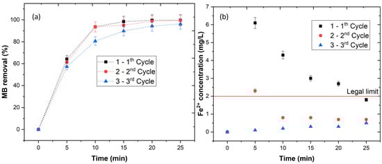 The results showed that Fe(II)-Mt catalyst is very efficient in the degradation of textile dyes, however, in order to reduce the operational costs in actual wastewater treatment plants (WWTP), the catalyst should be recovered and reused. Therefore, three consecutive cycles were performed. The results in Figure 3a showed an MB removal of 99.7, 99.5, and 96.3%, respectively, for the first, second and third cycles, respectively. These results showed that the catalyst releases the iron to the aqueous solution taking place the photo-Fenton process. Afterwards, the catalyst reabsorbs the iron at the end of the reaction and reuse it again for three cycles. In order to prove this idea, the leaching concentration was determined during the three cycles (Figure 3b). These results showed a high Fe2+ release during the first 5 min, decreasing its concentration from 5 to 25 min, clearly showing the absorption of iron back to the catalyst. In addition, the final Fe2+ concentration values were observed to be far below the legal limits for the discharge of treated waters—2 mg L−1 [16].