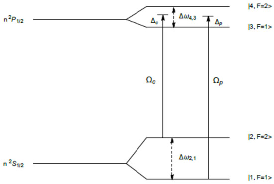 The energy-level diagram of alkali metal atoms 23Na, 87Rb, and 39K is shown in Figure 1. We consider the transitions n 2S1/2 – n 2P1/2, where n = 3, 5, and 4, for sodium, rubidium and potassium vapors, respectively. The kets |1⟩ =|n 2S1/2, F = 1⟩, |2⟩ =|n 2S1/2, F = 2⟩, and |3⟩ =|n 2P1/2, F = 1⟩, |4⟩ =|n 2P1/2, F = 2⟩ refer to the lower and upper hyperfine states, respectively. The quantum number F stands for the total angular momentum. The probe and drive fields are detuned by Δp and Δr from the transitions |1⟩ ↔ |3⟩ and |2⟩ ↔ |3⟩, respectively. For experimental atomic data on alkali metal vapors, we refer to [9,10,11,12]. The fields with Rabi frequencies Ωp and Ωr connect the optical transitions |1⟩ → |3⟩, |4⟩ and |2⟩ → |3⟩, |4⟩, respectively.