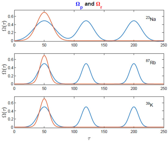Pulse profiles for Ωp(τ) and Ωr(τ) fields at the entrance point ζ = 0 for different alkali vapors. Time, as well as Rabi frequencies associated with the probe and drive channels, are presented in relative units.