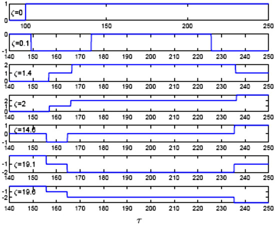 Figure 3 illustrates phase patterns resulting from the drive channel as a function of time for different prolonged distances inside a sodium gas medium. Probe and drive fields are resonantly coupled to the excited hyperfine state |3, F = 1⟩. Phase patterns are presented through weak criteria, in which the phases are mainly produced by the second (upper) and perturbing Λ subsystem. Beyond that, at the injection point, ζ = 0, the drive pulse indicates phase switching from zero to π, with a starting time of τ = 100 and corresponding to the T2 interval. Through such a period, the pulse envelope profile undergoes interference between the far end of the first pulse and the leading edge or the front of the second pulse in the train. Notably, the phase remains zero for times within the conventional EIT, T1 section. For long time sections, such as T2 and T3, we have noticed the generation of drive pulses. The generated pulses in the drive channel propagate across the medium with different phase patterns.