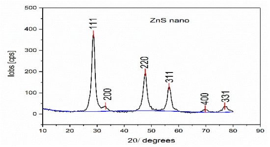 The XRD patterns of the ZnS particles indicate the most indexed peaks at (111), (200), (220), (311), (400), and (331) are shown in Figure 1. It is clear that the pattern represents a polycrystalline material. One can also observe that the peaks are significantly broad. Such results confirm that the particles belong to nano-sized crystals according to the (ICDD) reference card No. 04-004-3804 the pronounced peaks correspond to the cubic crystal system [5]. The spacing between the planes of the crystal is d and the lattice parameters a, b, and c for the cross ponding Miller indices (hkl) were calculated according to the following Equation (2) [6], which produced a result of 5.404 Å and a corresponding value of 5.392 Å.