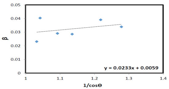 The W–H [10] method relies on the principle that the approximate formulas for size broadening (β) and strain broadening (βε) vary quite significantly with respect to the Bragg angle, θ [11]. The strain induced broadening arising from crystal imperfections and distortion can be calculated as in Equation (3). Either the maximum tensile strain alone or the maximum compressive strain alone can be calculated from the observed broadening. If both crystallite size and strain contributions present independently of each other, then their combined effects can be determined by convolution. The W–H method can be simplifed by assuming that the convolution is a sum of β and βc using the form of [8].