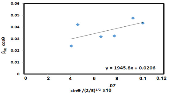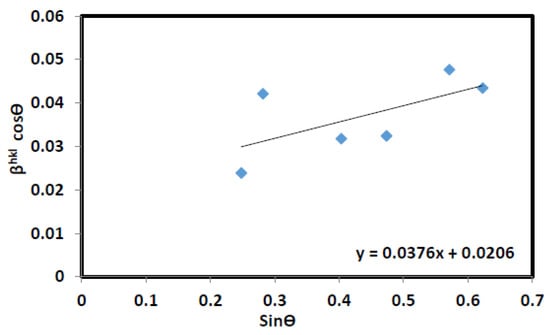 Equation (5) represents the uniform deformation model (UDM), according to which the strain is assumed to be uniform in all crystallographic directions. The plot in Figure 3 shows that βhklcosθ against sinθ would give a crystallite size that corresponds to the y-intercept and strain due to lattice deformation in the sample that can be calculated from the slope of the graph. The graph indicates that the ZnS exhibits a positive gradient, which represents the positive strain in the sample.