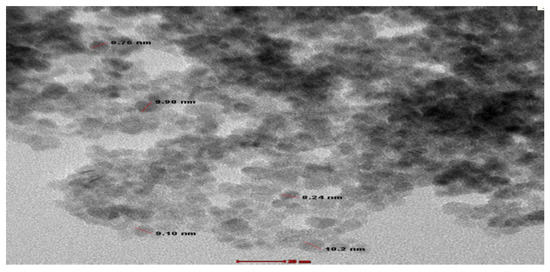 The typical morphology of the obtained ZnS nanoparticles was necessary in order to know their exact size and structure by using direct TEM measurement. Figure 6 is a TEM image that shows the presence of a large number of nearly spherical ZnS nanoparticles with distinct grain boundaries. The particle size range was found to be 8–10 nm, which is nearly consistent with the particle sizes obtained from XRD observations. Therefore, the diameter and the size distribution of the nanoparticles are difficult to determine simply by viewing TEM images [11,12].
