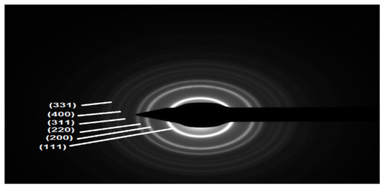Figure 7 shows the selected area electron diffraction (SAED) pattern of the ZnS nanoparticles. The SAED pattern shows a set of rings which relate to diffraction from different planes of the ZnS nanocrystallites. The pattern shows many rings, and among these the strongest six rings correspond to the (111), (200), (220), (311), (400), and (311) planes of the cubic phase of the ZnS. This result is consistent with the XRD analysis. It was observed that the particles were well separated and of a spherical shape, as it shown by the magnified view of the nanocrystals.