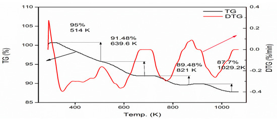 Figure 8 represents a combined TG and DTG plot produced to explore the stability and the transitions which might occur. The TG curve of ZnS nanoparticles was obtained at a heating rate of 283 K min−1 under a nitrogen atmosphere from room temperature up to 1100 K due to the strong water absorption of ZnS at 313 K.