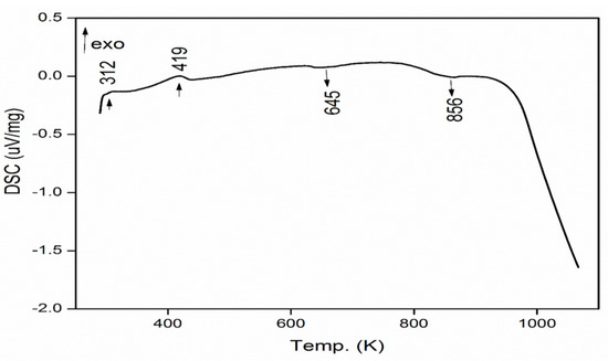 Differential scanning calorimetry (DSC) measures endothermic and exothermic processes in materials as a function of temperature and heat flow. The first exothermic peak was observed at 419 K [16] (Figure 9). This peak was attributed to the evaporation of water molecules. The second strong endothermic peak was observed at 654 K, probably corresponding to the lattice deformation of the ZnS, but above 873 K in DSC curve, there was a smooth downward trend with significant weight loss. This may be due to the residual sulfur ions released from the sample.