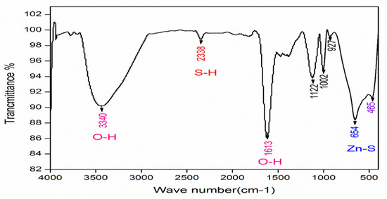 The infrared absorption spectra (FTIR) of the ZnS were recorded in the range of (400–4000) cm− as is shown in Figure 10. Spectrum analysis of the ZnS shows that despite the successive washes with absolute ethanol, traces of solvent still exist. This is confirmed by the presence of a broad and intense band at around 3340 cm−1 which is attributed to to the vibrations of the valence of the O-H mode in the H2O molecules. This peak may be due to water present in the sample. The small and weak peak observed at 2338 cm−1 may be due to the formation of S-H bonds (H2S). The presence of a band around 1613 cm−1 [17] may correspond to the O–H bending of water molecules [18] and the absorption at 1122 cm−1 is attributed to SO4−. The weak additional bands observed at 1002 cm−1 and 924 cm−1 [19] indicate the presence of resonance interaction between the vibrational modes of the sulfide ions in the crystal [19]. The vibration of the ZnS bond is confirmed by the presence of medium and strong bands located around 1122 cm−1 and 654 cm−1 [20,21], and the small and weak band at 465 cm−1 is attributed to the metal sulfur bond.