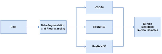 Breast cancer ultrasound images used in the study were first processed through data preprocessing and augmentation steps. Then, multi-class classification was made with deep learning-based VGG16, ResNet50 and ResNeXt50 models. The scheme related to this is given in Figure 1. The preprocessing steps performed on the dataset are center-crop and normalization. Input dimensions are resized to 400 × 400 with preprocessing. Data augmentation steps are shift scale rotate, rgb shift, random brightness contrast and color jitter. Classification studies were performed on the P100 GPU offered on the Kaggle platform.