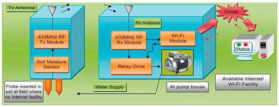 The IoT-based greenhouse automation system is designed in [3], where the light intensity levels and soil moisture readings are collected. The fan is automatically turned on to reduce the temperature. The system lacks the remote water sprinkling feature, and it does not provide monitoring via an Android application. The authors in [4] introduced agricultural applications based on IoT for the purposes of monitoring the moisture and nutrients of citrus, but the system is complex and costly. The authors in [5] designed an IoT-based system which allows the user to monitor their farm using mobile applications and the web. This research faced water control challenges on the farm. Systems introduced in [6,7] are useful for water control in the context of IoT-based agriculture, but are costly for farmers to use. The system introduced uses LPWAN communication and Bluetooth technologies in the farm [8]. Hence, the system will be useful only when the user is within a short distance of their farm/land.