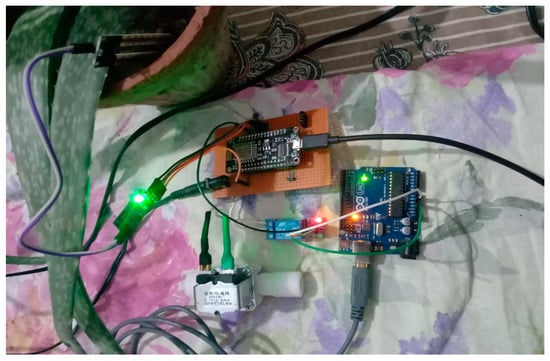 In this paper, various sensors, such as DHT-11 and soil moisture sensors, are integrated to measure the climatic conditions in the environment, as shown in Figure 1. Based on basic plant requirements, the nutrient solution is also provided to ensure plant growth by sprinkling water via a relay and solenoid valve. The temperature and humidity readings are collected in the greenhouse using a DHT-11 sensor, and soil moisture levels are gathered using a soil moisture sensor. The proposed system then transmits the information gathered by the sensors to the Blynk IoT platform, using the ESP-8266 Wi-Fi module, for users to monitor the different parameters of the plant remotely.
