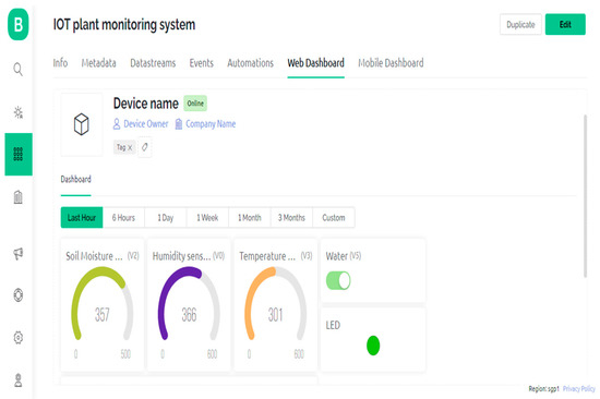 The IoT-based Smart Plant Monitoring System is designed to monitor and maintain the growth and health of plants. The system works by collecting data from various sensors and then sending that data to a mobile application through the internet. The system starts by collecting data from the DHT11 sensor, which measures the temperature and humidity of the environment. The data is then sent to the Arduino microcontroller, which processes the data and sends it to the Blynk app through the ESP8266 Wi-Fi module. The Blynk app then displays the temperature and humidity data in real time. If the temperature or humidity falls outside of a specified range, the Arduino sends a notification to the user’s mobile device or computer. The user can then adjust the settings on the app to optimize the environment for the plants. The solenoid valve is controlled by the Arduino based on the data from the sensors. It can be programmed to automatically open and close in order to water the plants. The relay is controlled by the Arduino, which sends a signal to the relay to open or close the valve. Overall, the system is designed to provide the user with real-time data and remote control over the environment, which can help to optimize the growth of plants and reduce the workload of the user. The Arduino microcontroller acts as the brain of the system, processing the data from the sensors and controlling the other components. The Blynk app provides a user-friendly interface for interacting with the system, and the ESP8266 connects the system to the internet. The power adapter/power supply provides power to the system. Figure 2 depicts the testing of the proposed system on an aloe-vera plant. From this test, satisfactory results were obtained.