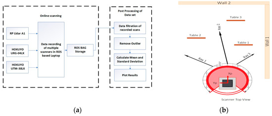 A laptop with an ROS (Robot Operating System)-based program has been connected to each scanner through a USB interface. ROS is an open-source software package used for interfacing various hardware for creating complex and customized models for research and development of real-world robotic applications [14]. After the data have been recorded on the laptop, it is then post-processed by using Matlab (MathWorks, Natick, MA, USA) for calculation and comparison of statistical values for mean, standard deviation and absolute error of multiple target objects. Figure 3 shows the block diagram and workflow for both online and offline procedures and a 2D layout of this experimental test setup.