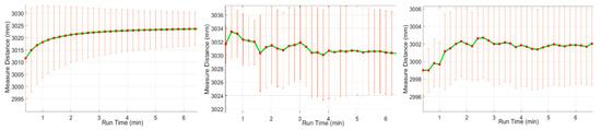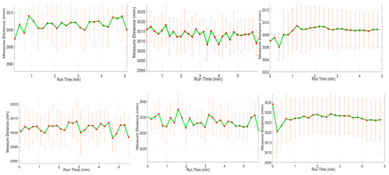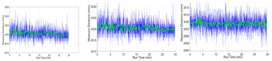 Laser scanners can produce inaccurate range values for stationary objects due to internal warming caused by the embedded circuit and motor confined in a small, packed area. This is generally known as the drift phenomenon, and it is an important aspect to recognize it effects on measurement with respect to time. The test was conducted for half an hour to analyze this effect. The results for each laser scanner are shown in Figure 4. The range plots of measured scans for each scanner have been expressed in blue color and the sampled mean values in green color in the same figure. It is clearly observed that after almost 10 min, the values are stabilized and repeatable.