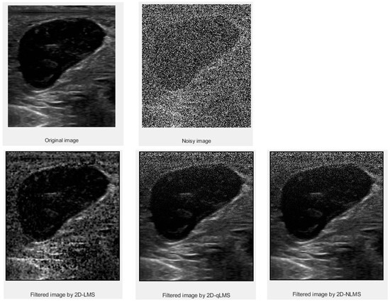Adaptive filters provide a better performance and results when removing noise from images. They provide better image enhancement, image compression, and noise cancellation for 2D signals, i.e., images. Among these, the two dimensional least mean square (2DLMS) [8] algorithm is widely used because of its simplicity, and although it has low computational complexity, the convergence of this algorithm is slow. Therefore, many variants of the least mean square algorithm have been proposed to make convergence faster, e.g., the quaternion least mean square (QLMS) [9] and normalized least mean square (NLMS) [10] algorithms, and to improve its efficiency. In this paper, we used additive white Gaussian noise in ultrasound images and applied these algorithms to remove Gaussian noise from images.