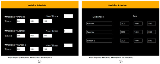 GUI for medicine entry. (a) Add new medicine schedule; (b) medicine schedule.