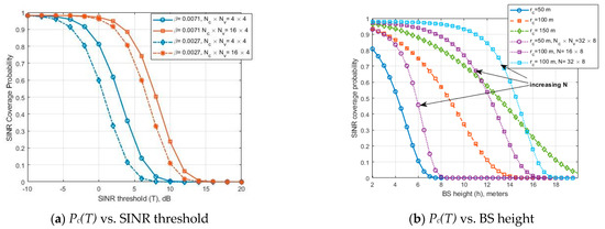 In Figure 1a, we examine the impact of UcylA at blockage parameters (β = 0.0071, 0.0027) representing different blockage densities. It can be observed that at high blockage density (β = 0.0027), the coverage is improved by using a high configuration of the antenna elements. Figure 1b presents the SINR coverage probability with respect to BS height at different cell radius = 50, 100, 150 m for an antenna configuration = 16 × 4. It can be seen that at these radii, the coverage probability reduces as the height of BS is increased; because of increased interference power from nearby elevated BSs. The detrimental effect of height is more severe in the case of low cell radius ( = 50 m). It can also be observed that for the case of = 50 m and 100 m, and at fixed BS height (e.g., 6 m), a significant increase in coverage probability can be obtained by increasing the antenna array size to 16 × 8 or 32 × 8. However, this figure also dictates that at a particular radius, there is a certain range of BS height for which coverage probability can be improved by increasing the array elements, after which coverage probability falls to zero. This gives designers a choice to select the optimum configuration of array size at a certain BS height for different cell radii.