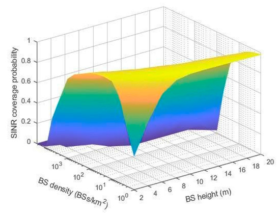 In Figure 2, we present a 3D plot to observe the joint impact of BS height and BS density on the SINR coverage probability. It can be seen that there is a certain BS height at a particular BS density that maximizes coverage probability. Consequently, this provides network designers a choice to jointly optimize the BS density to BS height tradeoff.