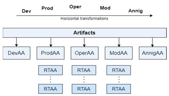 At the top level, one can discuss a single model. At the middle level, each phase uses its own artifacts. Each phase uses its own agile architectures (AA). Each of the AA architectures is matched with a set of runtime architectures (RTAA).