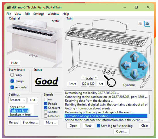 Figure 5). On the left of the form, there is a static image of the object (electric piano), which can be hidden by pressing the “Hide” button. On the right is a schematic image of the object, which can be moved horizontally and vertically through the blue circle. It is possible to zoom in front of the magnifying glass image (plus and minus buttons), manually set the size by pressing the “Set” button and reset to the original dimensions, which are presented by default, by pressing the “Reset” button. On the left, you can select the event levels, Easily, Danger and Seriously, and see the current diagnostic status “Good”; meaning everything is fine and the components are in good working order. Below is the configuration of sensors and signal sources, Keys, Pedals, Speakers, Functions and Connectors, with the possibility of additional configuration using the “More...” button. The log with additional functions is displayed on the right: clear, save to a file, open a file with a log and open it on the site in a table with a search using the “Web” button. Only the last 20 lines of the log are displayed on the form element to avoid memory overflow errors.