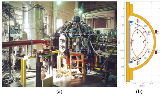 - Korenev, P.S.; Mitrishkin, Y.V.; Patrov, M.I. Rekonstruktsiya ravnovesnogo raspredeleniya parametrov plasmi tokamaka po vneshnim magnitnim izmereniyam i postroyeniye lineynikh plazmennikh modeley [Reconstruction of equilibrium distribution of plasma parameters on the base of external magnetic measurements and construction of plasma linear models]. Mechatron. Autom. Control 2016, 17, 254–265. (In Russian) [Google Scholar]