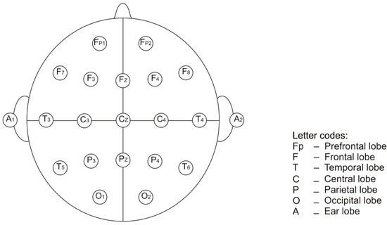 An EEG signal is composed of the integration of neuronal activity in various spatial and temporal scales. To take an EEG, a certain number of scalp electrodes are installed on the human scalp in accordance with a standardized scheme for applying electrodes. Figure 1 shows the layout of electrodes according to the international 10–20 system. The scalp electrodes’ identifiers consist of letters indicating the region of the brain and numbers (odd numbers for the left hemisphere of the brain, even numbers for the right) or the letter “z” (for the midline). Electrodes A1 and A2 are connected to the left and right earlobes and are used as reference electrodes [15].